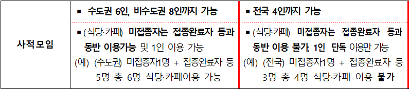 현재 접종 여부 관계없이 수도권 6인, 비수도권 8인까지 가능한 인원 기준을 전국 4인으로 조정합니다.