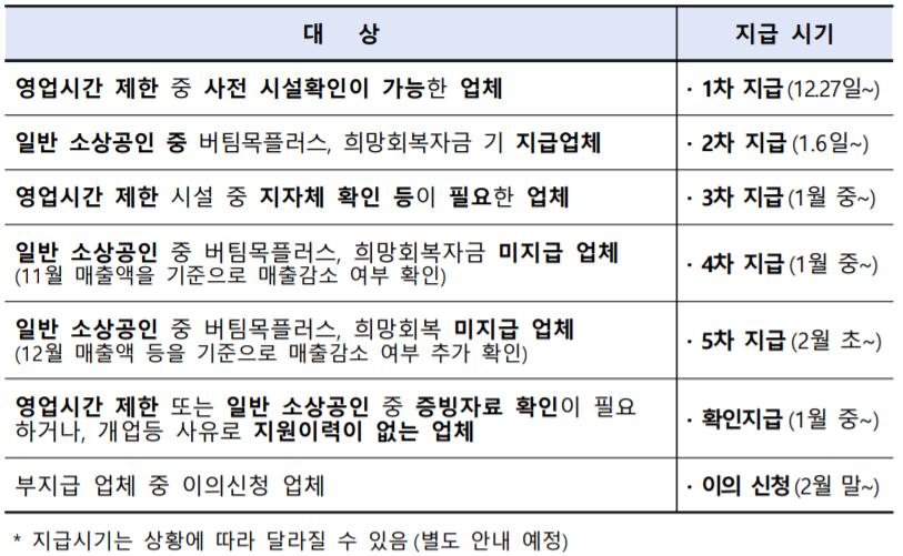 지급대상 : '21. 12. 18일 이후 영업시간 제한 조치를 받은 소상공인·소기업 중