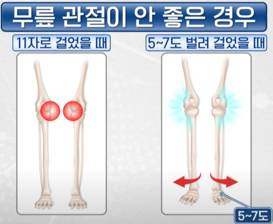 무릎이 안 좋은 사람이 11자로 걸을 경우 무릎관절 안쪽이 닿아서 통증이 생길 수 있다.