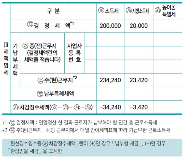 회사로부터 발급받은 근로소득 원천징수 영수증 첫 페이지 하단의'Ⅲ 세액 명세'에서 확인