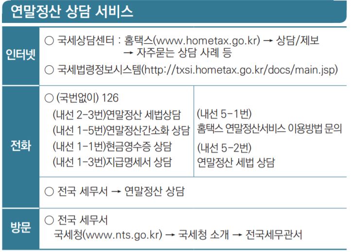 연말정산 관련 더 자세한 사항은 국세청 홈페이지(www.nts.go.kr)에서 확인하실 수 있습니다.