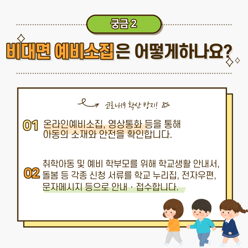 - 예비소집에 응하지 않는 아동에 대해서도 유선연락, 가정방문, 학교 방문 요청 등